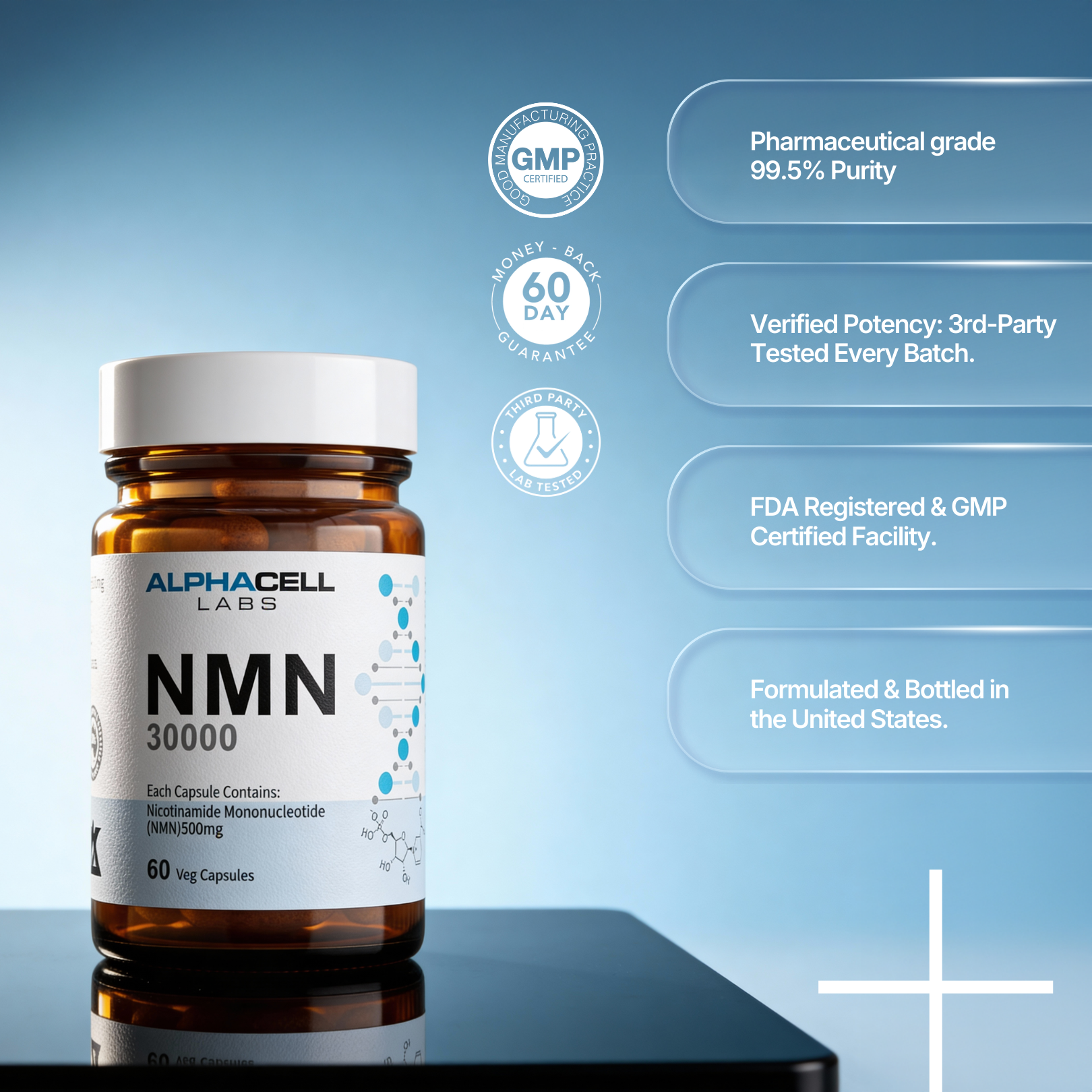 Why Top Performers Trust AlphaCell NMN.When it comes to NMN, we don't cut corners. Our mission is MEASURABLE purity. We formulate with pharmaceutical-grade NMN (99.5% purity) and obsessively 3rd party lab test every batch. No filler, no fluff—just clinical-grade ingredients designed to help you unlock real, measurable results.