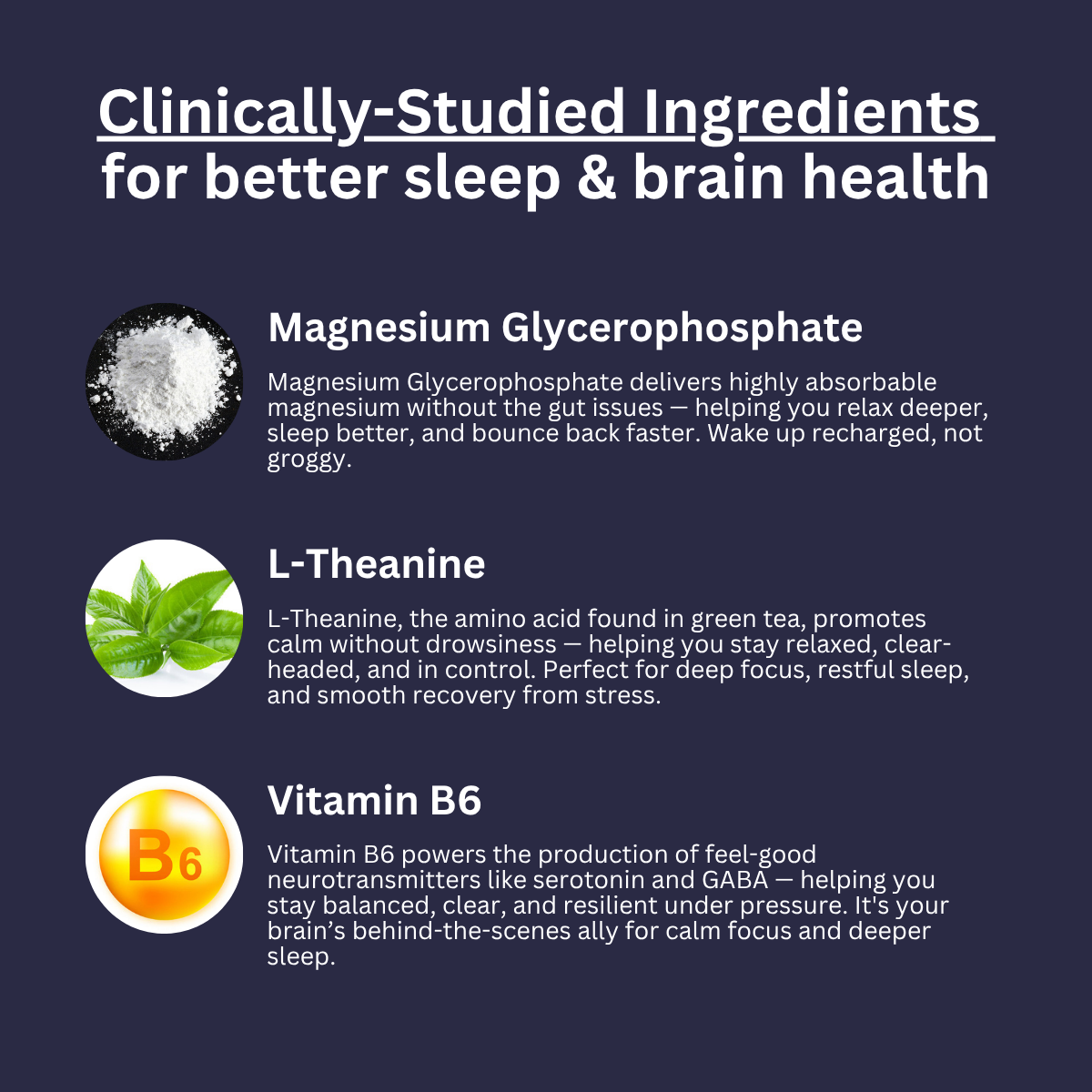 Many magnesium supplements use cheap, poorly-absorbed forms that upset your stomach. Our Doctor-Formulated protocol uses highly bioavailable Magnesium Bisglycinate, paired with pure L-Theanine and B6. Every batch is 3rd Party Tested to guarantee purity and potency.