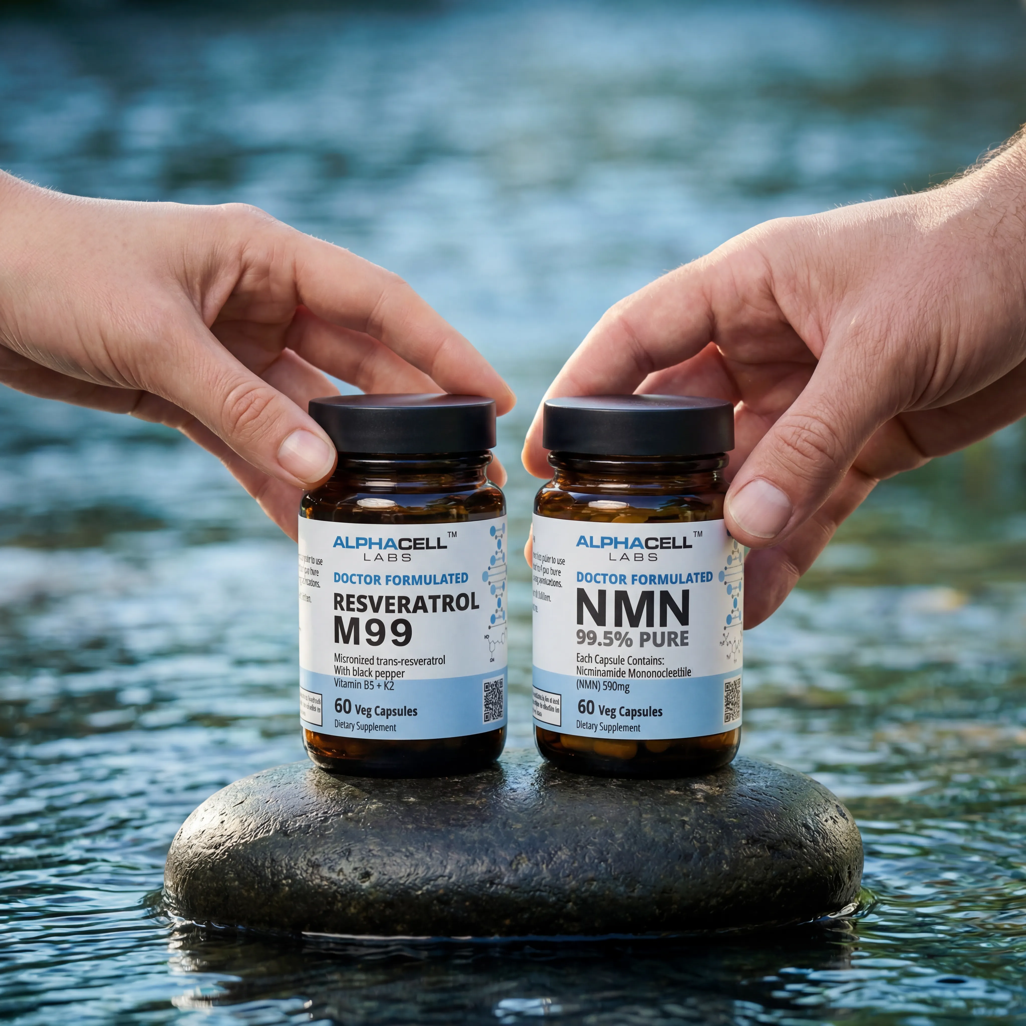 The Longevity Stack is built around two compounds widely studied in longevity science, NMN and micronized trans-resveratrol (M99) selected for their complementary roles in cellular energy metabolism and cellular signaling.