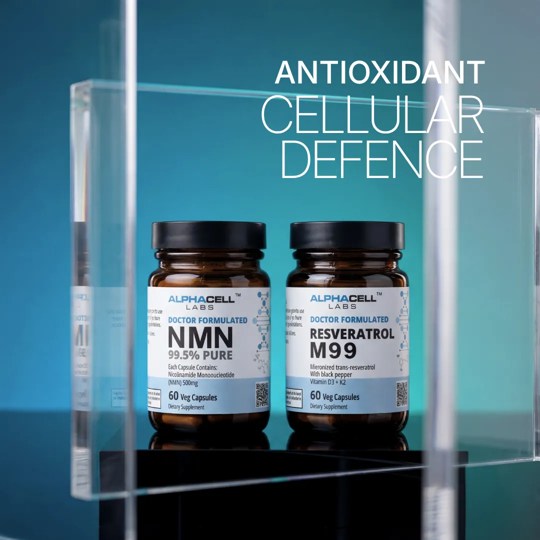 M99 delivers a concentrated, micronized polyphenol profile designed to support the body’s natural antioxidant defences, while NMN supports cellular processes involved in maintaining energy balance and repair.